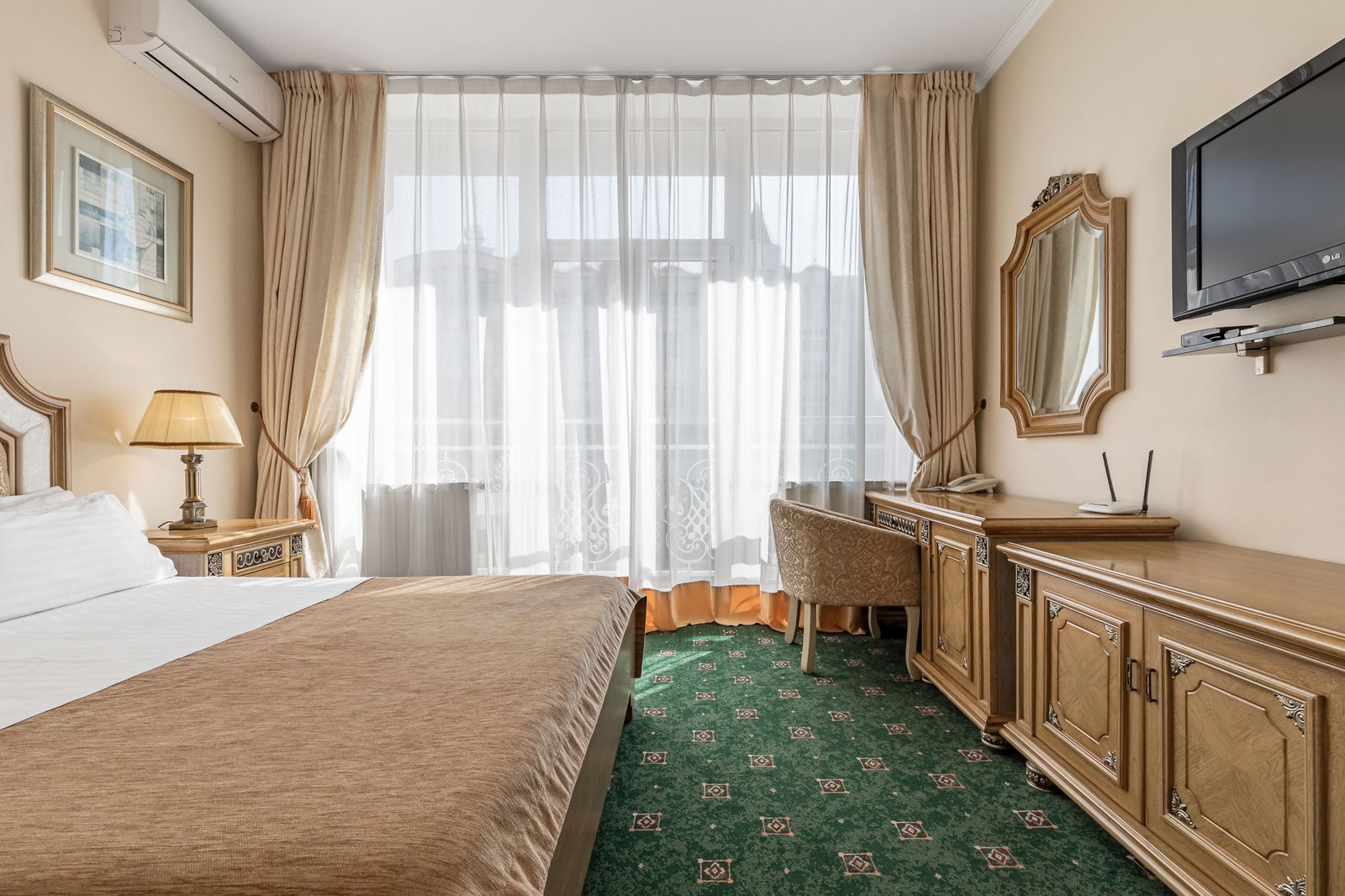 Comfortable room with a double bed and a private bathroom. Equipped with air conditioning, a balcony, a TV and a refrigerator for a pleasant stay.